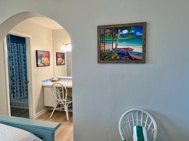 Enjoy the beautiful sea view overlooking town from your own large private covered balcony. This spacious king guest room offers a kitchenette area and ensuite bathroom.