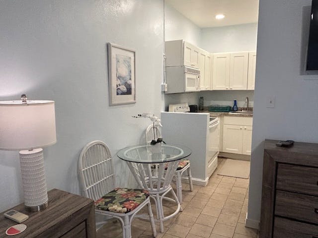 Enjoy the beautiful sea view overlooking town from your own private covered balcony. This king guest room offers a full kitchen, sitting area, ensuite bathroom, and everything you need for an extended stay.